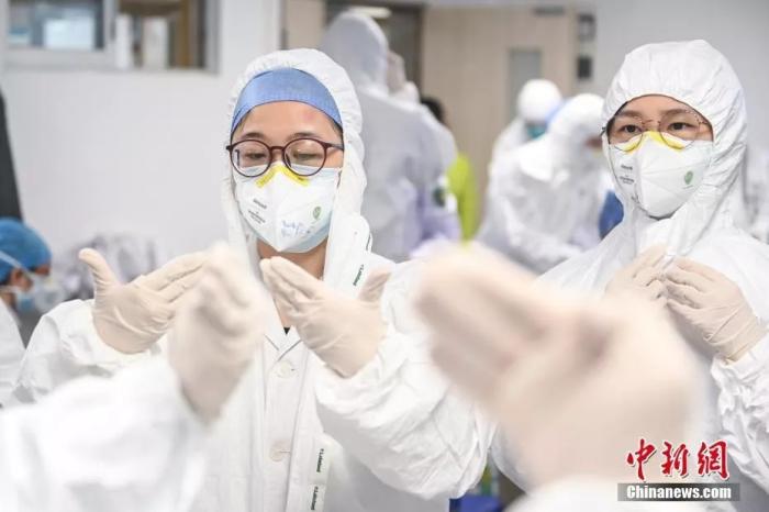 醫護人員接受穿脫防護服培訓。中新社記者 陳驥旻 攝