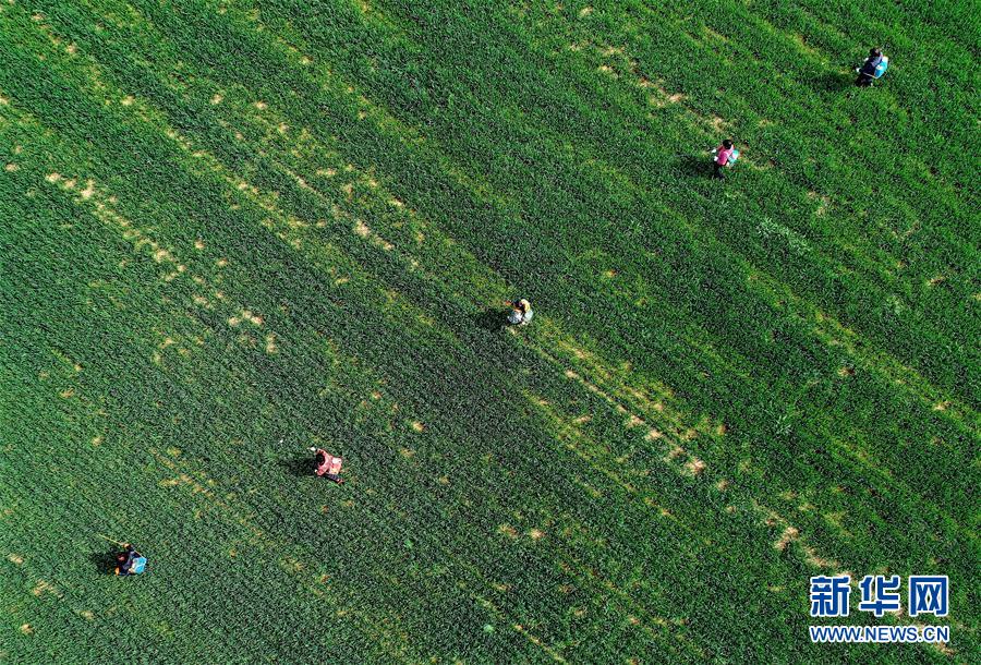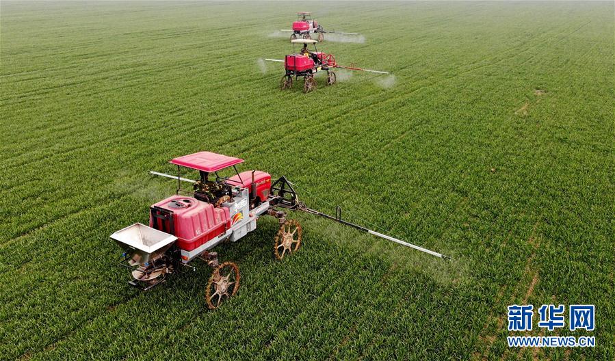 3月9日,河北省南和縣郝橋鎮後西村農(nong) 民操作農(nong) 業(ye) 機械在麥田噴灑農(nong) 藥(無人機照片)。 新華社記者 朱旭東(dong) 攝