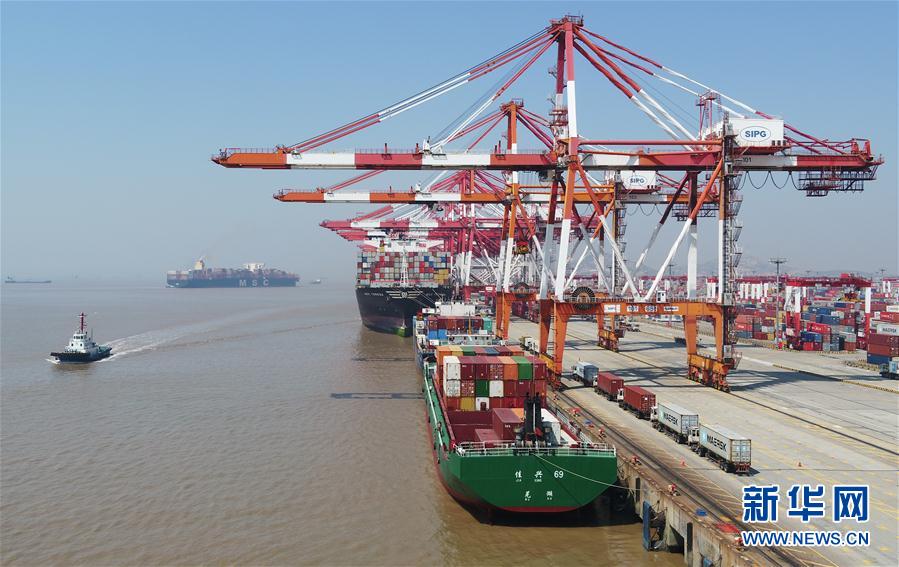 這是3月18日拍攝的上海洋山港集裝箱碼頭(無人機照片)。新華社記者 丁汀 攝