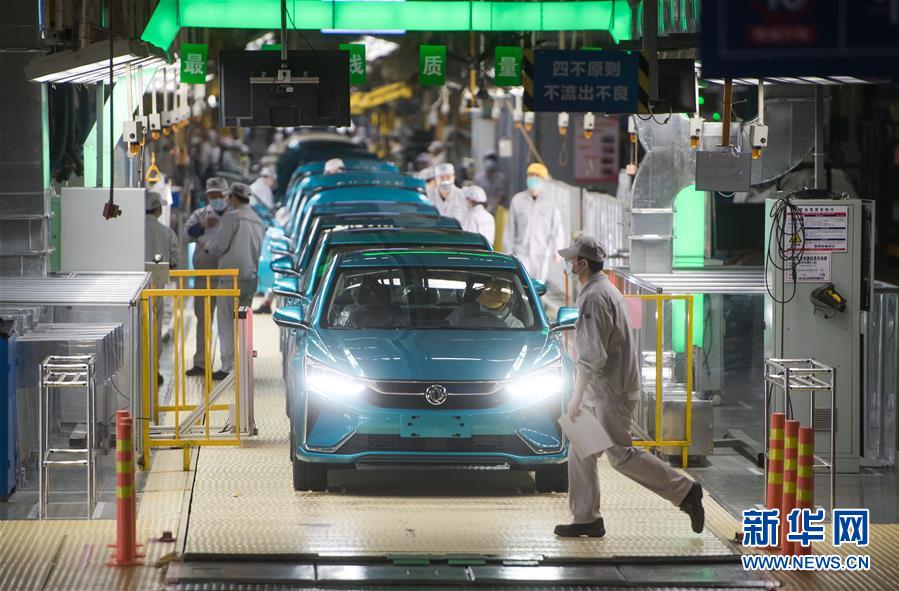 3月24日,在位於(yu) 武漢的東(dong) 風乘用車公司工廠總裝車間,工人在流水線上生產(chan) 作業(ye) 。新華社記者 肖藝九 攝