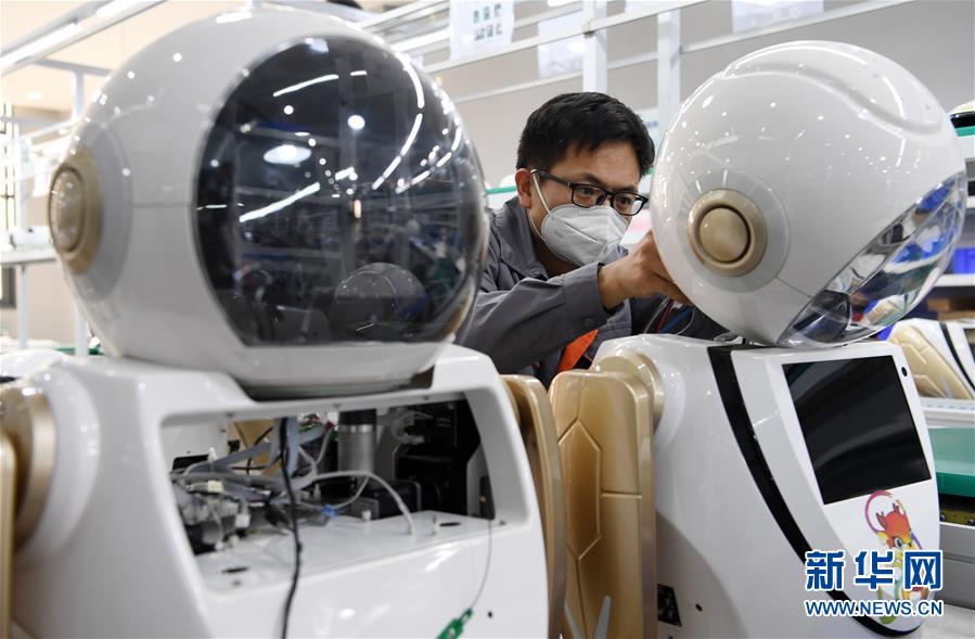 在甘肅張掖市甘州區一家機器人製造企業(ye) ,工作人員在改裝醫用機器人(3月23日攝)。 新華社記者 範培珅 攝
