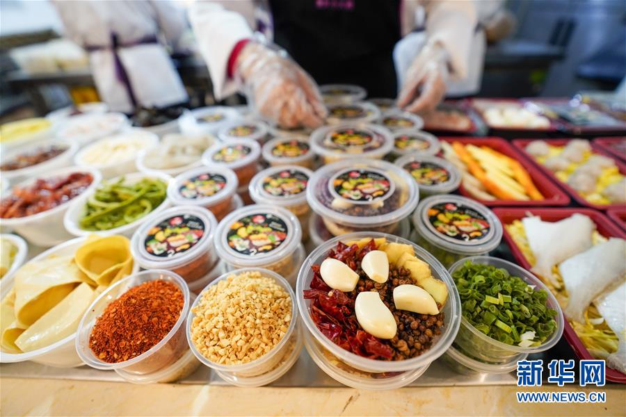 在重慶小天鵝火鍋標準化生鮮火鍋外賣的門店內(nei) ,後廚的工作人員在清點生鮮火鍋外賣訂單的火鍋配料(3月13日攝)。 新華社記者 劉潺 攝