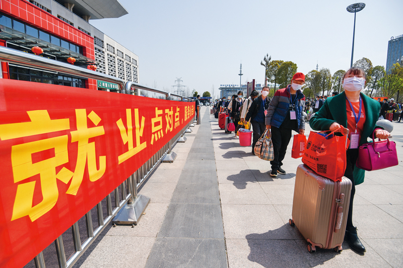 農(nong) 民工是我國產(chan) 業(ye) 工人的主體(ti) 。要建立健全農(nong) 民工返崗務工溝通協調機製,加強輸出地和輸入地信息對接、運輸對接、健康檢測對接,暢通“點對點、一站式”複工服務通道,推動疫情防控期間務工人員安全有序返崗。圖為(wei) 2020年3月19日,湖北省首批務工人員返崗就業(ye) 專(zhuan) 列從(cong) 荊州火車站出發,外出務工人員正在進站乘車。 人民圖片 黃誌剛/攝