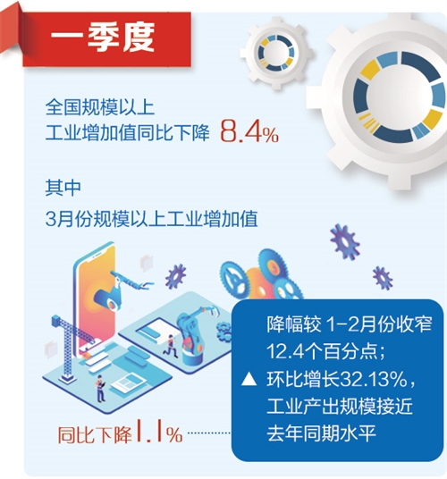 工業(ye) 生產(chan) 降幅明顯收窄。一季度,規模以上工業(ye) 增加值同比下降8.4%,降幅較前兩(liang) 個(ge) 月收窄5.1個(ge) 百分點。尤其是3月份,工業(ye) 增加值同比下降1.1%,降幅較前兩(liang) 個(ge) 月收窄12.4個(ge) 百分點,工業(ye) 產(chan) 出規模已接近上年同期水平。