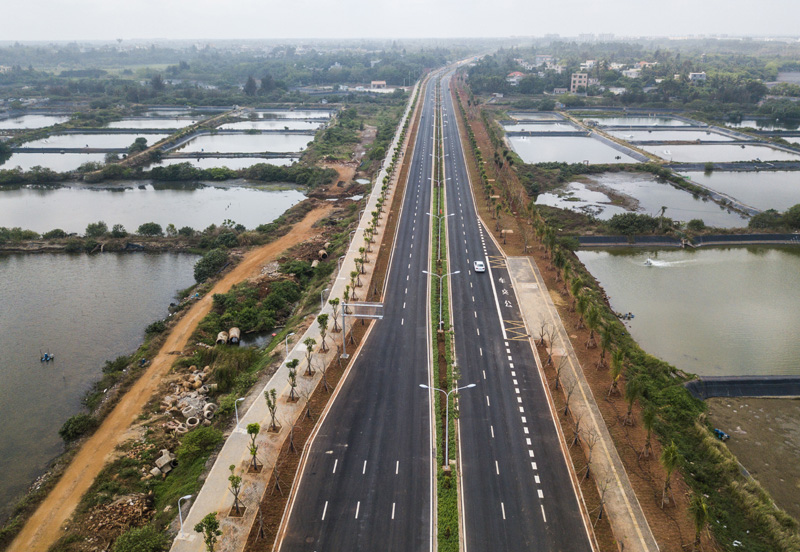 這是4月1日拍攝的位於(yu) 海口江東(dong) 新區的東(dong) 寨港大道(無人機照片)。新華社記者 蒲曉旭 攝
