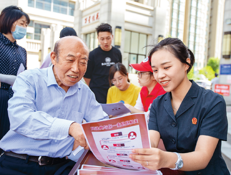 2020年6月6日,江蘇省海安市立發街道嘉麟社區聯合海安市人民法院開展“民法典讓生活更美好”送法進社區活動,法院工作人員和社區普法誌願者把民法典內(nei) 容簡明易懂地告知居民,提高公民的法律素養(yang) ,用民法典護航美好生活。 中新社發 翟慧勇/攝