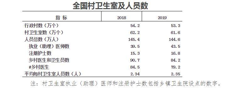 國家衛健委發布的《2019年我國衛生健康事業(ye) 發展統計公報》顯示,2019年底全國共有鄉(xiang) 村醫生79.2萬(wan) 人,較2018年減少5.3萬(wan) 人。以外,與(yu) 2018年相比,2019年村衛生室數量減少0.6萬(wan) 個(ge) ,人員總數也有所減少。