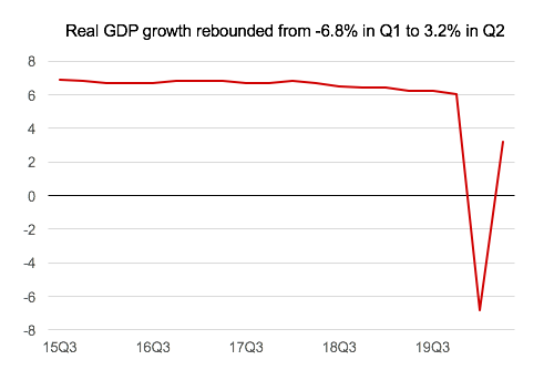 一季度,受疫情影響,中國GDP收縮了6.8%。但在二季度回到了3.2%的正增長。之前有討論是否會(hui) 看到一個(ge) V型、U型或是L型的複蘇。