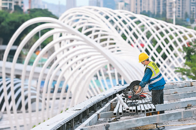 深圳又一地標建築——128米高的深圳寶安濱海文化公園摩天輪目前正加緊建設。圖為(wei) 建設者在建設現場施工。新華社記者 劉大偉(wei) 攝