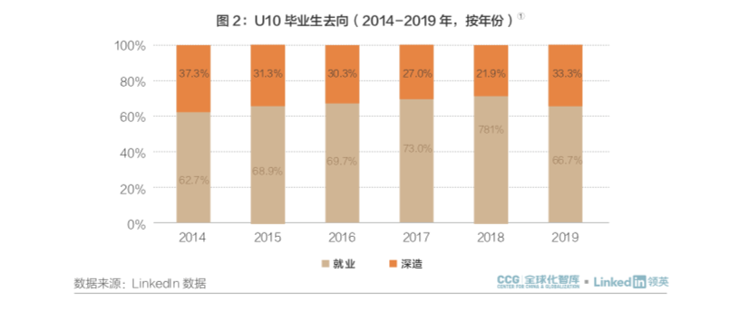 2. 2019 年,U10 畢業(ye) 生選擇深造的比例增長顯著,一改 2014 年以來就業(ye) 比例連續增長的趨勢。