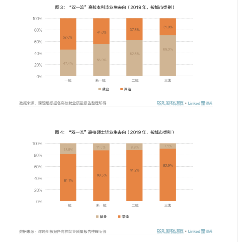 3. 在發展程度相對較高的城市,本科畢業(ye) 生更願意選擇繼續深造,並在碩士畢業(ye) 後進入就業(ye) 市場;在發展程度相對較低的城市中,其本科畢業(ye) 生更傾(qing) 向於(yu) 選擇就業(ye) ,碩士畢業(ye) 生選擇繼續深造的比例則相對較高