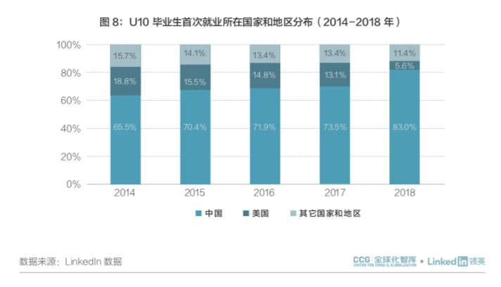 報告指出,在國內(nei) 就業(ye) 的畢業(ye) 生占比逐年增加,人才回流趨勢明顯。根據報告數據顯示,U10畢業(ye) 生中首次就業(ye) 在中國的比例在2014-2018年間逐年增長,且2018年的增長尤為(wei) 明顯,從(cong) 73.5%增加到83.0%。從(cong) U10畢業(ye) 生出國留學與(yu) 國外就業(ye) 的數據對比看,雖然超過七成畢業(ye) 生在深造選擇中傾(qing) 向於(yu) 去往國外,但超過八成畢業(ye) 生的首次就業(ye) 所在國為(wei) 中國,呈現出“出國留學—回國就業(ye) ”的良性人才環流趨勢。中外經濟發展狀況及留學、就業(ye) 、移民政策和國際關(guan) 係的變化,對中國國際化人才流動與(yu) 人才回流的影響更趨積極。
