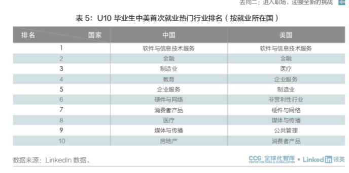 8. 高校畢業(ye) 生中美首次就業(ye) 對比:熱門行業(ye) 相似度較高,重點集中在軟件與(yu) 信息服務業(ye) 、製造業(ye) 、教育、企業(ye) 服務和金融行業(ye) ;在中國就業(ye) 更青睞消費品、硬件與(yu) 網絡、媒體(ti) 與(yu) 傳(chuan) 播行業(ye) ,在美國就業(ye) 則更關(guan) 注醫療、零售、休閑與(yu) 旅遊、非營利性行業(ye) 和公共管理行業(ye)