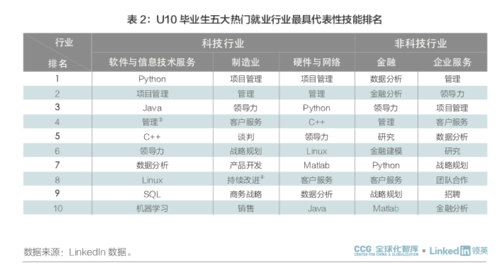 報告表明,管理類和數據類技能正在成為(wei) 各行業(ye) 的代表性技能。“管理”“項目管理”“戰略規劃”以及“領導力”等管理類技能,“Python”“Java”“C++”以及“數據分析”等數據類技能是U10畢業(ye) 生就業(ye) 熱門行業(ye) 的最具代表性技能。