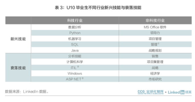 從(cong) U10畢業(ye) 生不同行業(ye) 的新興(xing) 技能與(yu) 衰落技能 的發展來看,科技行業(ye) 越來越注重專(zhuan) 業(ye) 技能與(yu) 創新,大數據與(yu) 人工智能等數據類技能興(xing) 起,原有的基礎係統操作與(yu) IT服務管理類技能正在被取代;非科技行業(ye) 則更加關(guan) 注產(chan) 品價(jia) 值及專(zhuan) 業(ye) 服務能力,領導力和戰略規劃能力等管理類技能愈發重要,原有的市場研究與(yu) 宏觀管理技能正在衰落。