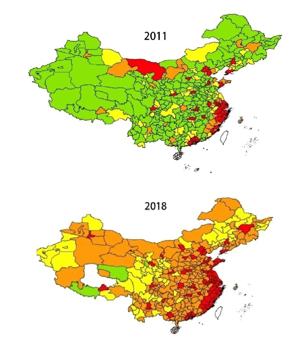 數字金融誕生之初就展示出非常強的普惠金融特性。如圖6兩(liang) 張地圖,分別展示的是2011年和2018年北京大學製作的分地區數字普惠金融指數,由北京大學數字金融研究中心和螞蟻金服聯合開發。圖中上邊是2011年的指數,下邊是2018年的指數。兩(liang) 張地圖將全國地級市按發展水平標出不同顏色,從(cong) 紅色、橙色、黃色到綠色,代表發展水平從(cong) 高到低。