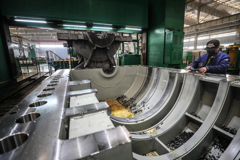 沈陽鼓風機集團股份有限公司的工人在車間進行生產(chan) 工作(2020年2月10日攝)。新華社記者 潘昱龍 攝