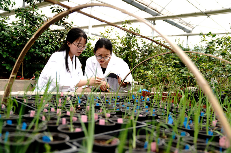 上海植物園科研人員程琳(左)、張蕾蕾在溫室觀察記錄花菖蒲新品種生長情況(2020年6月5日攝)。新華社記者 張建鬆 攝