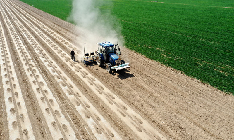 在新疆生產(chan) 建設兵團第六師共青團農(nong) 場,一台安裝北鬥導航自動駕駛係統的播種機在播種棉花(2020年4月8日攝,無人機照片)。新華社發(李華北 攝)