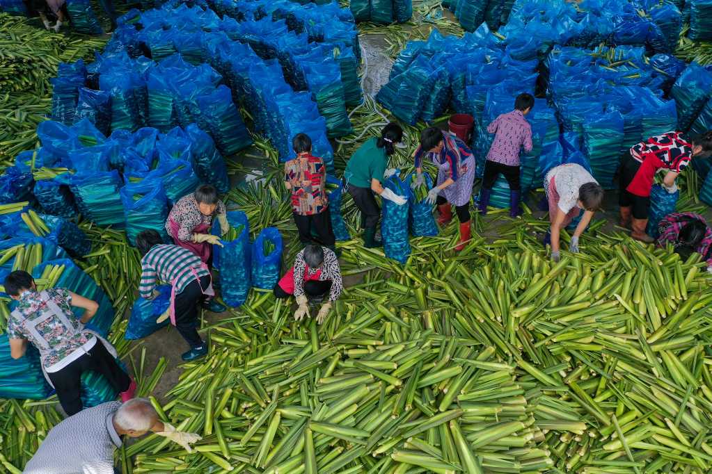 2021年8月25日,景寧佘族自治縣大漈鄉(xiang) 大漈村茭白交易市場,婦女老人圍著新收割的茭白打包冷藏(無人機照片)。 新華社發(李肅人 攝)