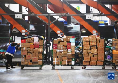在中國郵政集團有限公司河南省鄭州郵區中心,工作人員在轉移快遞包裹(11月11日攝)。新華社記者 張浩然 攝