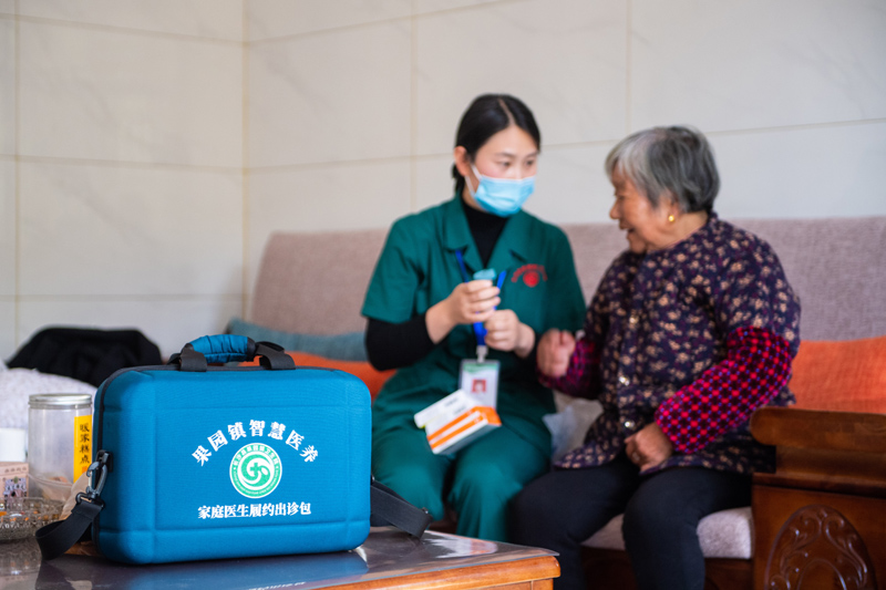 在湖南省長沙市長沙縣果園鎮楊泗廟社區,醫務人員在指導居家老人用藥(2021年11月12日攝)。新華社記者 陳思汗 攝