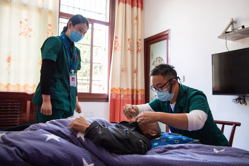 在湖南省長沙市長沙縣果園鎮田漢社區,醫務人員為(wei) 居家老人做針灸治療(2021年11月12日攝)。新華社記者 陳思汗 攝