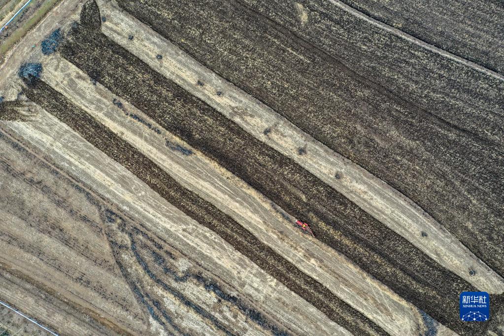 在吉林省吉林市昌邑區孤店子鎮紅衛村,春新生態家庭農(nong) 場農(nong) 民駕駛農(nong) 機耕地(4月26日攝,無人機照片)。新華社記者 張楠 攝