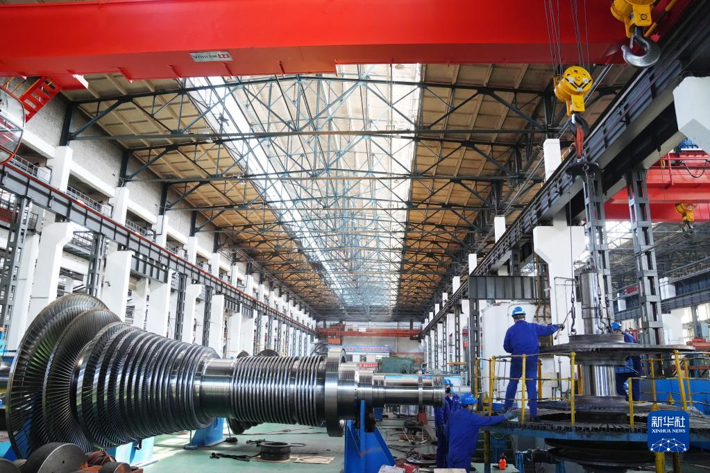 在哈電集團哈爾濱汽輪機廠有限責任公司生產(chan) 車間,工人在生產(chan) 作業(ye) (5月7日攝)。新華社記者 王建威 攝