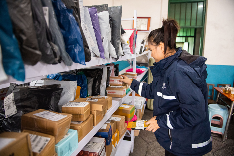 湖南省衡陽市耒陽市黃市鎮新生快遞鄉(xiang) 村服務站的站長胡夏在整理快遞(2021年11月3日攝)。新華社記者 陳思汗 攝