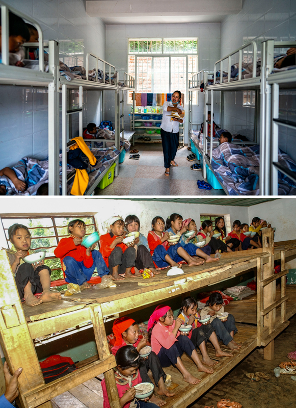 拚版照片:上圖為(wei) 2021年9月8日,雲(yun) 南省瀾滄拉祜族自治縣木戛鄉(xiang) 哈卜嗎村小學的學生在宿舍休息(新華社記者江文耀攝);下圖為(wei) 2003年,哈卜嗎村小學的學生在宿舍吃飯(新華社記者秦晴攝)。新華社發