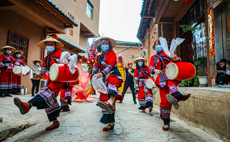 雲(yun) 南省昆明市晉寧區福安村村民在村裏一年一度的民俗活動上表演舞蹈(2022年4月5日攝)。新華社記者 江文耀 攝