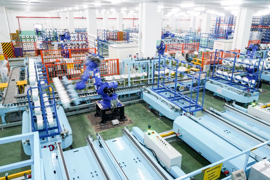 在位於(yu) 蘇州市吳江區盛澤鎮的恒力化纖工業(ye) 絲(si) 智能車間,機器人在車間內(nei) 自動作業(ye) (資料圖片)。新華社記者 李博 攝