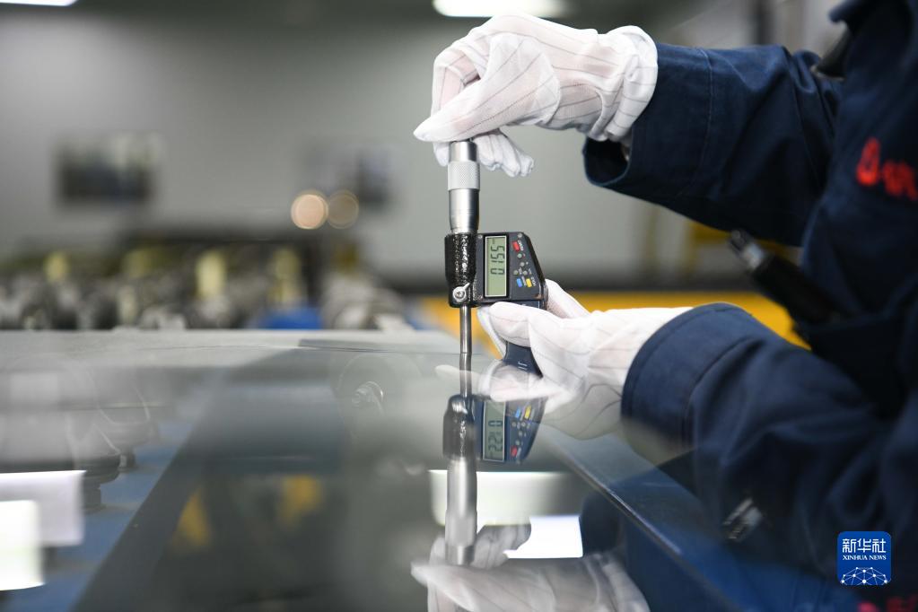 在位於(yu) 安徽省蚌埠市的蚌埠中建材信息顯示材料有限公司內(nei) ,工作人員在測量超薄電子信息顯示玻璃的厚度(2021年12月21日攝)。新華社記者 張端 攝