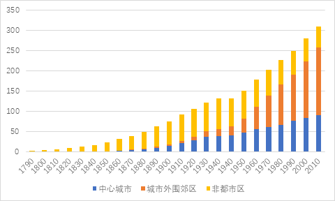 圖1:美國城鄉融合的表現-形成都市區(中心城市、郊區)和非都市區(鄉村和小城鎮)