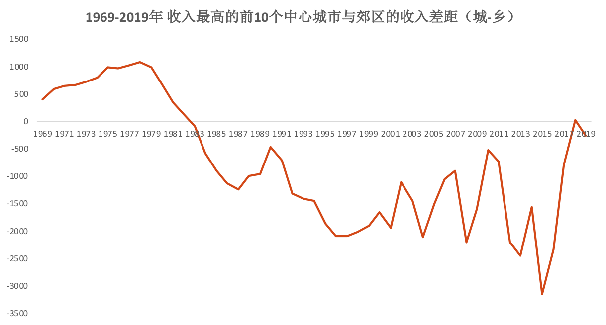 圖2:美國城鄉(xiang) 融合的表現-中心城區與(yu) 郊區的收入差距扭轉