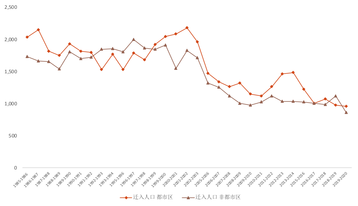 圖3:美國城鄉(xiang) 融合的表現-非都市區的人口遷入量與(yu) 都市區人口遷入量趨同