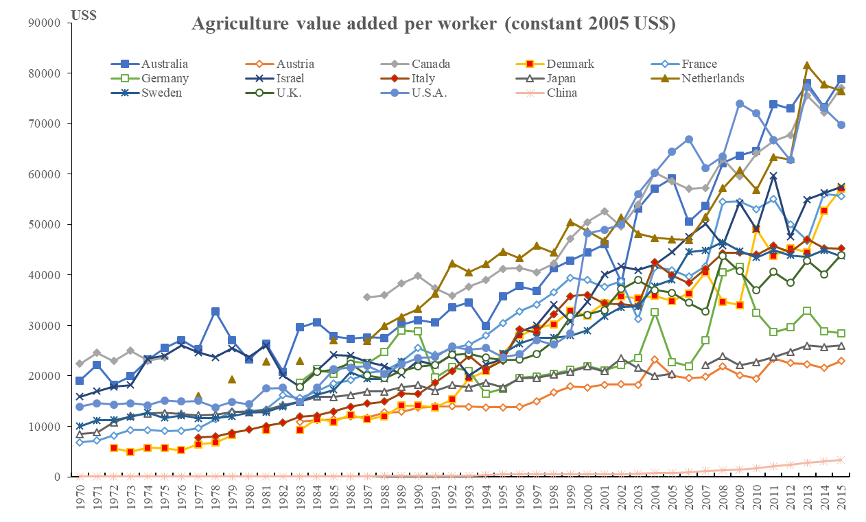 如圖5,西方城市化過程中兩(liang) 個(ge) 收入差距的縮小在中國沒有出現。中國在最快速城市化階段出現了城鄉(xiang) 收入差距拉大,第一是我們(men) 隻有快速城市化,但沒有城鄉(xiang) 融合。第二是我們(men) 城市化的模式是回村的城市化模式。在城市裏幹工作,幹到一定程度再回到農(nong) 村,這是全世界沒有的。第三是農(nong) 業(ye) 競爭(zheng) 力下降。現在一定要有一個(ge) 認識,農(nong) 業(ye) 的份額降到10%以後,各個(ge) 國家的農(nong) 業(ye) 到底在幹什麽(me) ?我們(men) 現在想到農(nong) 業(ye) 到10%,再到2%、1%,農(nong) 業(ye) 就可有可無了,這種觀點是錯誤的。所有國家的農(nong) 業(ye) 在降到10%以後,農(nong) 業(ye) 在變強,它的農(nong) 業(ye) 和原來的農(nong) 業(ye) 完全不一樣。中國由於(yu) 單向城市化的模式,最後農(nong) 業(ye) 競爭(zheng) 力進一步下降。(如圖6)我們(men) 現在隻有6%、7%的農(nong) 業(ye) ,這個(ge) 農(nong) 業(ye) 的競爭(zheng) 力是下降的,背後是農(nong) 業(ye) 成本上升,所有成本都在上升。