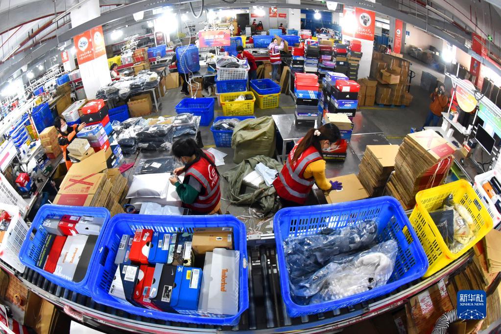 工人在江蘇省連雲(yun) 港市海州區天馬電商產(chan) 業(ye) 園按照訂單分揀貨品(2022年11月11日攝)。新華社發(耿玉和 攝)