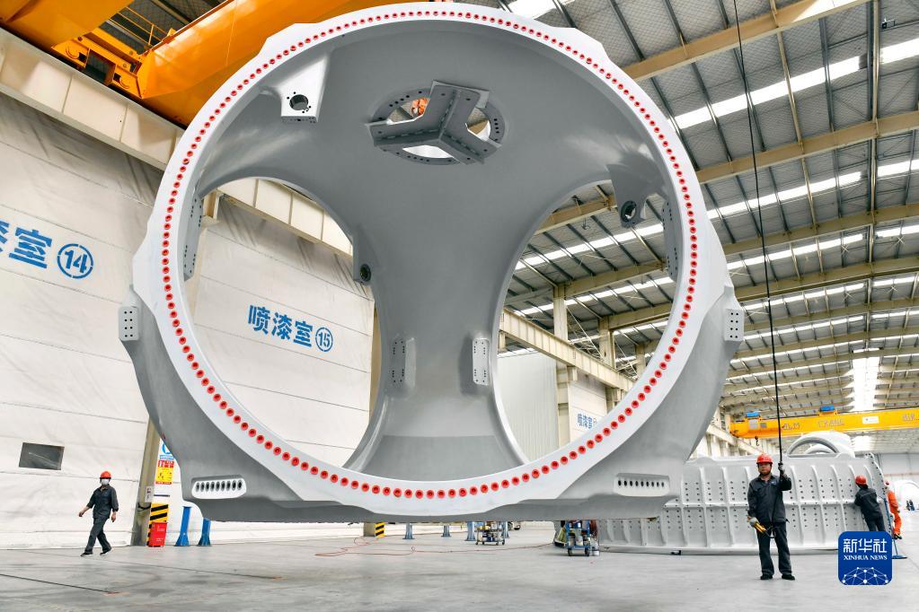 工作人員在山東(dong) 省惠民縣風電裝備產(chan) 業(ye) 基地一塗裝車間內(nei) 作業(ye) (2022年6月7日攝)。新華社記者 郭緒雷 攝