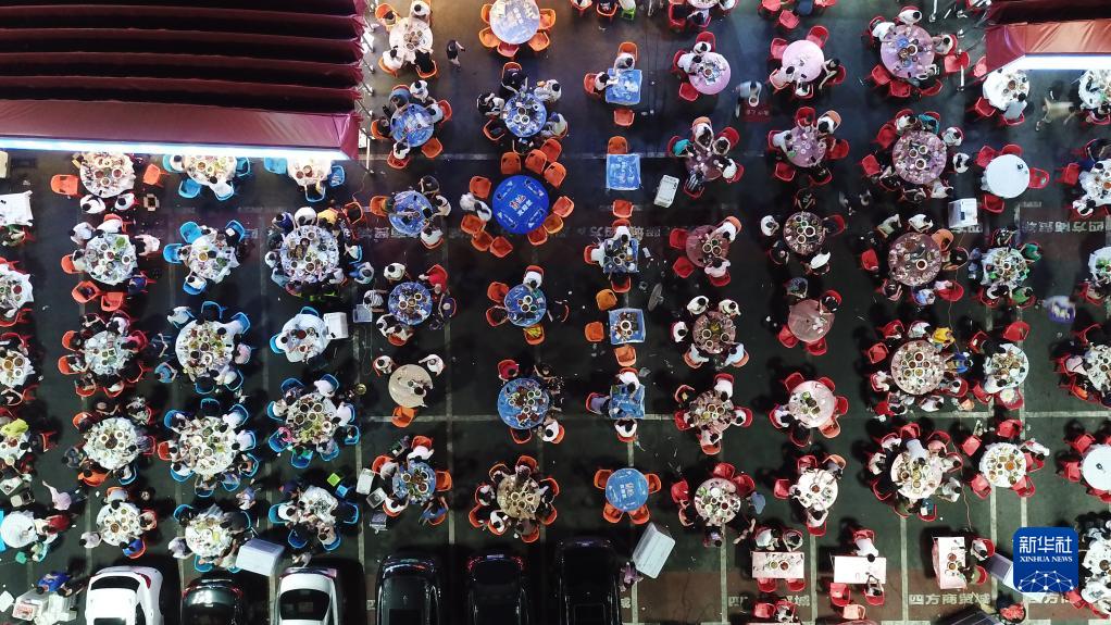 遊客在湖南長沙四方坪夜市就餐(2022年7月29日攝,無人機照片)。新華社記者 陳振海 攝