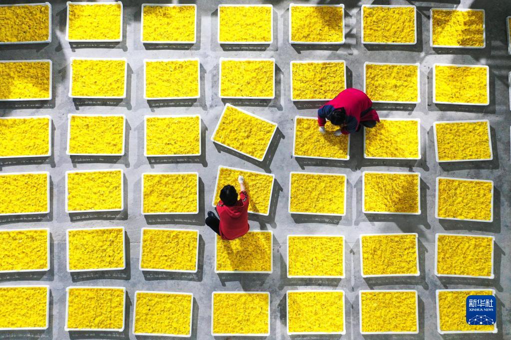 村民在貴州省貴定縣雲(yun) 霧鎮一菊花加工車間攤晾金絲(si) 皇菊(2022年10月20日攝,無人機照片)。新華社記者 楊文斌 攝