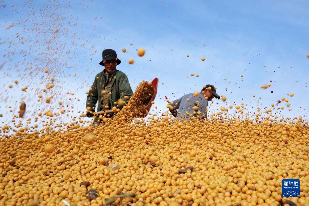 在北大荒農(nong) 墾集團有限公司北安分公司趙光農(nong) 場有限公司,工作人員在一處曬場的大豆堆上忙碌(2022年10月20日攝)。新華社記者 王建威 攝
