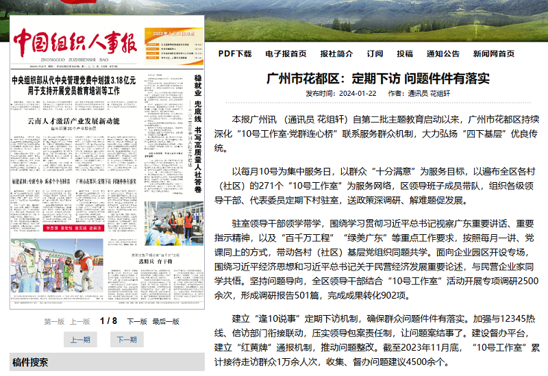 2024年1月22日《中國組織人事報》頭版報道《廣州市花都區:定期下訪 問題件件有落實》